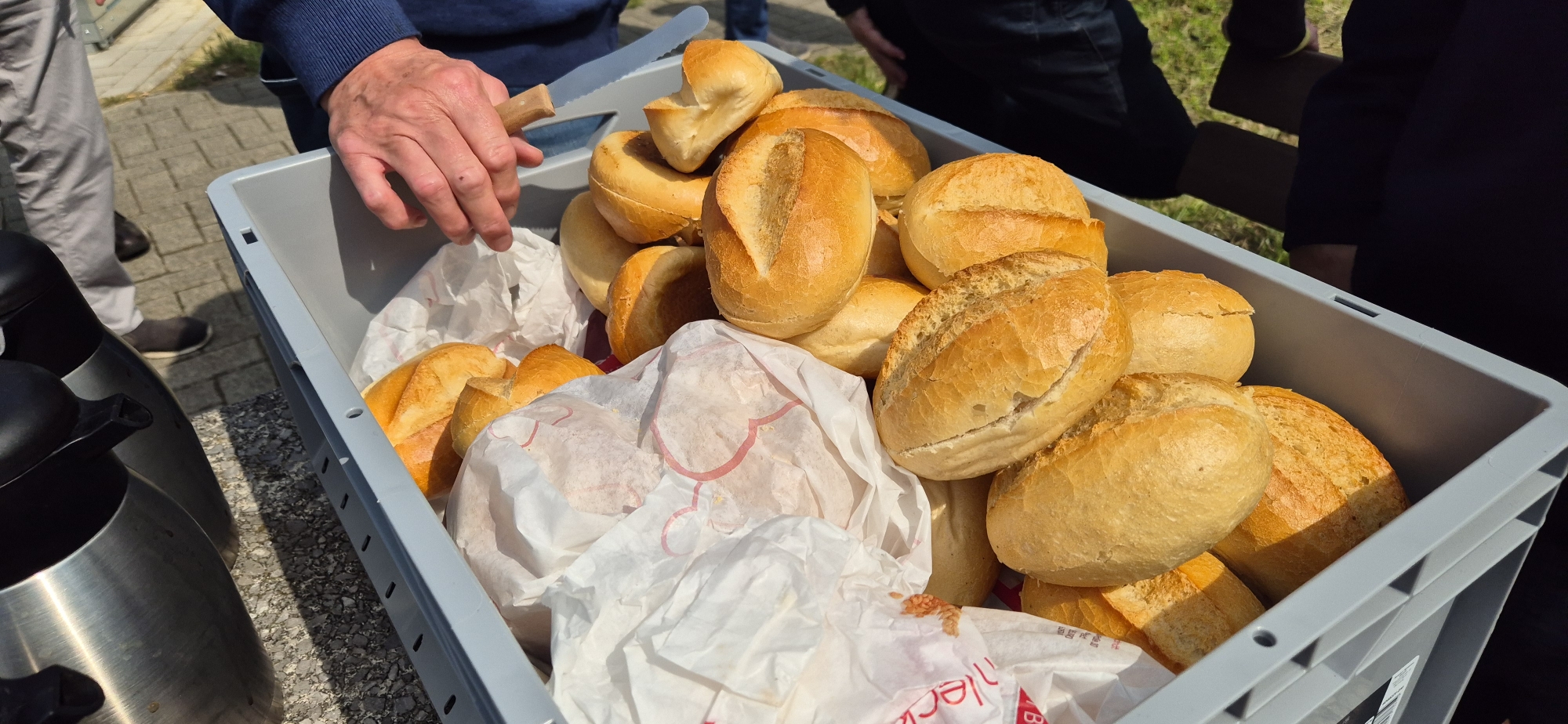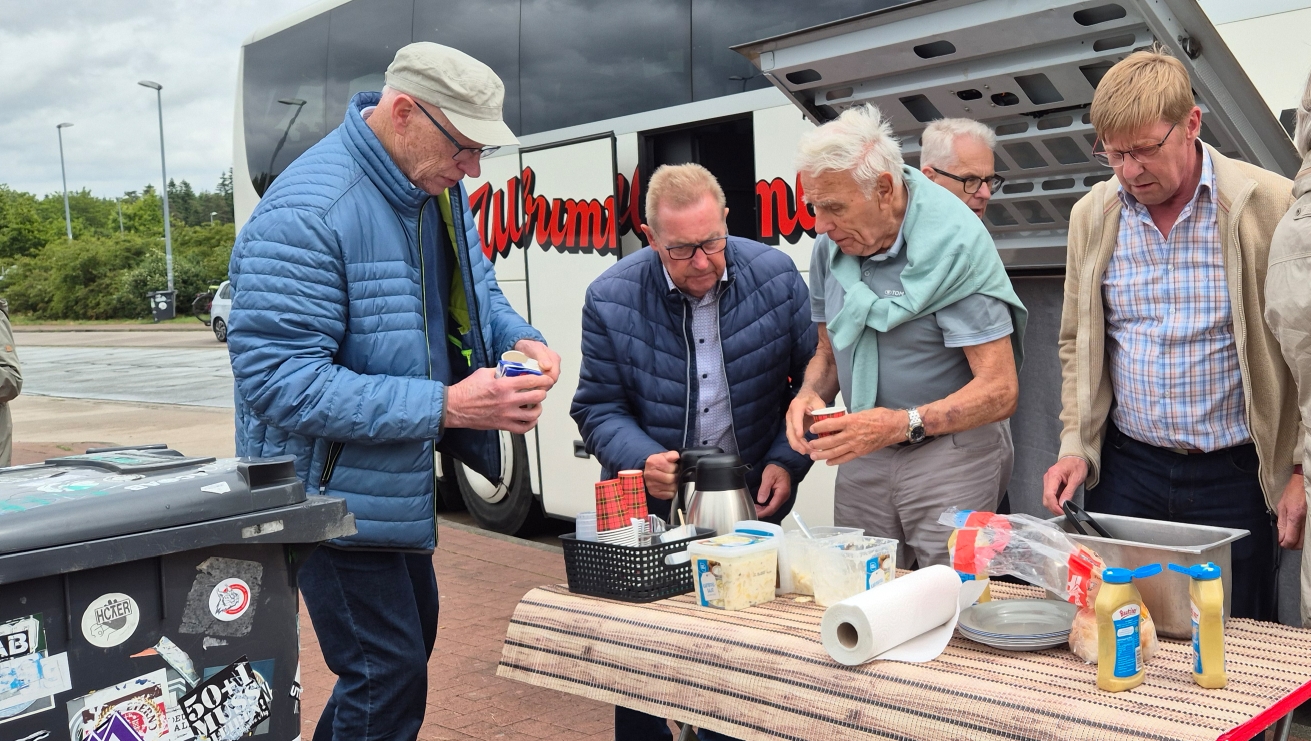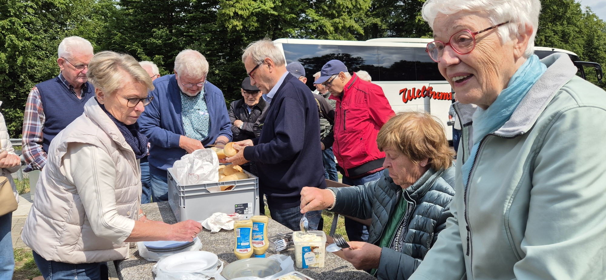 Deswegen also: Gesagt, getan! Hans-Peter Dieler, Georg Stegger, Manni Bußmann und Hans Zaksek boten kurz vor Ende der Sommersaison unserem Chor eine Tagesfahrt durch die nähere Umgebung an. Das Echo war groß, denn mit rund 40 Sängern bestiegen wir gut gelaunt einen Bus, der uns zunächst zum Hof Schulze Scholle bei Gescher brachte, wo wir uns an einem reichlichen Frühstücksbufett stärkten.