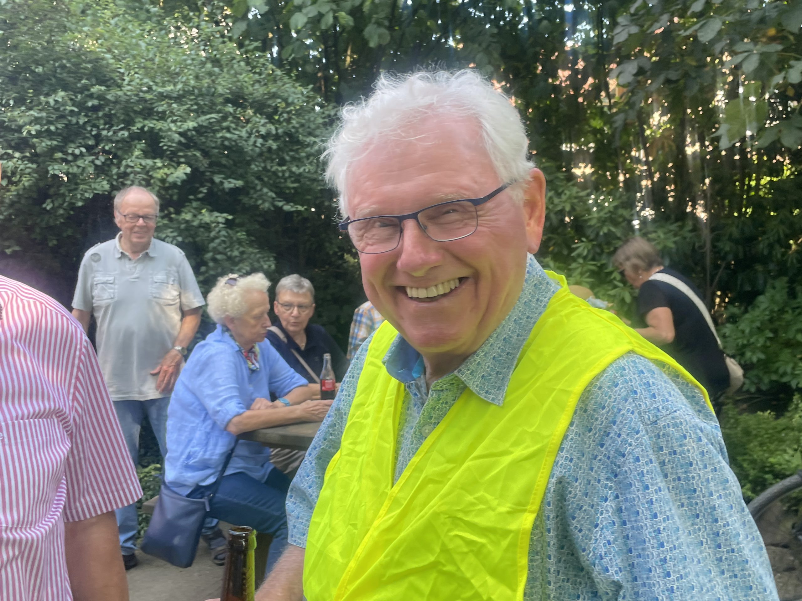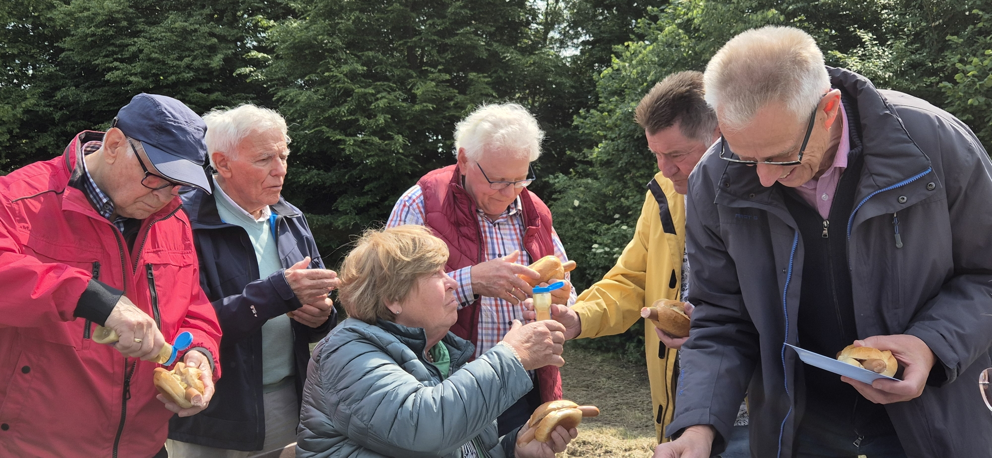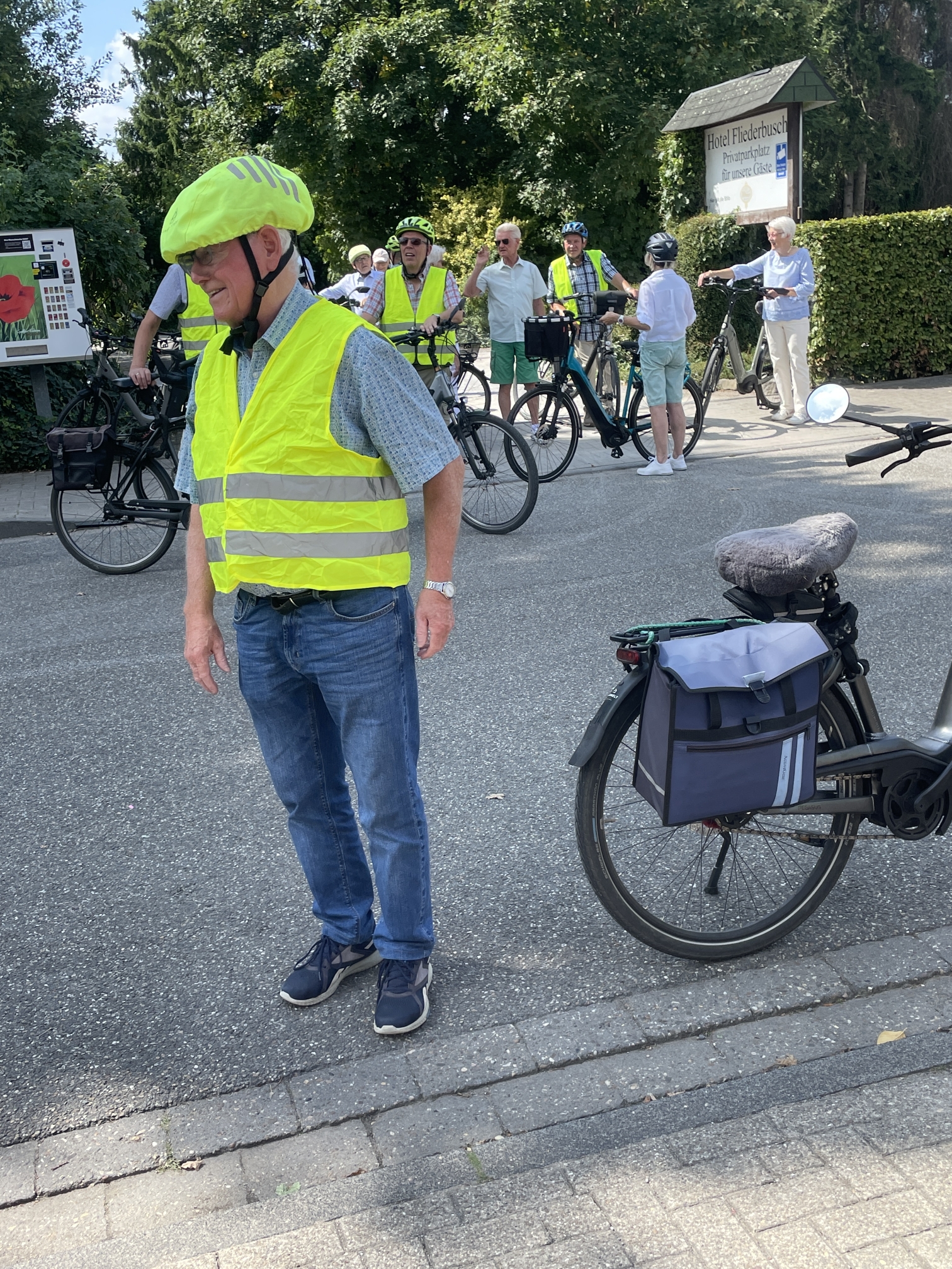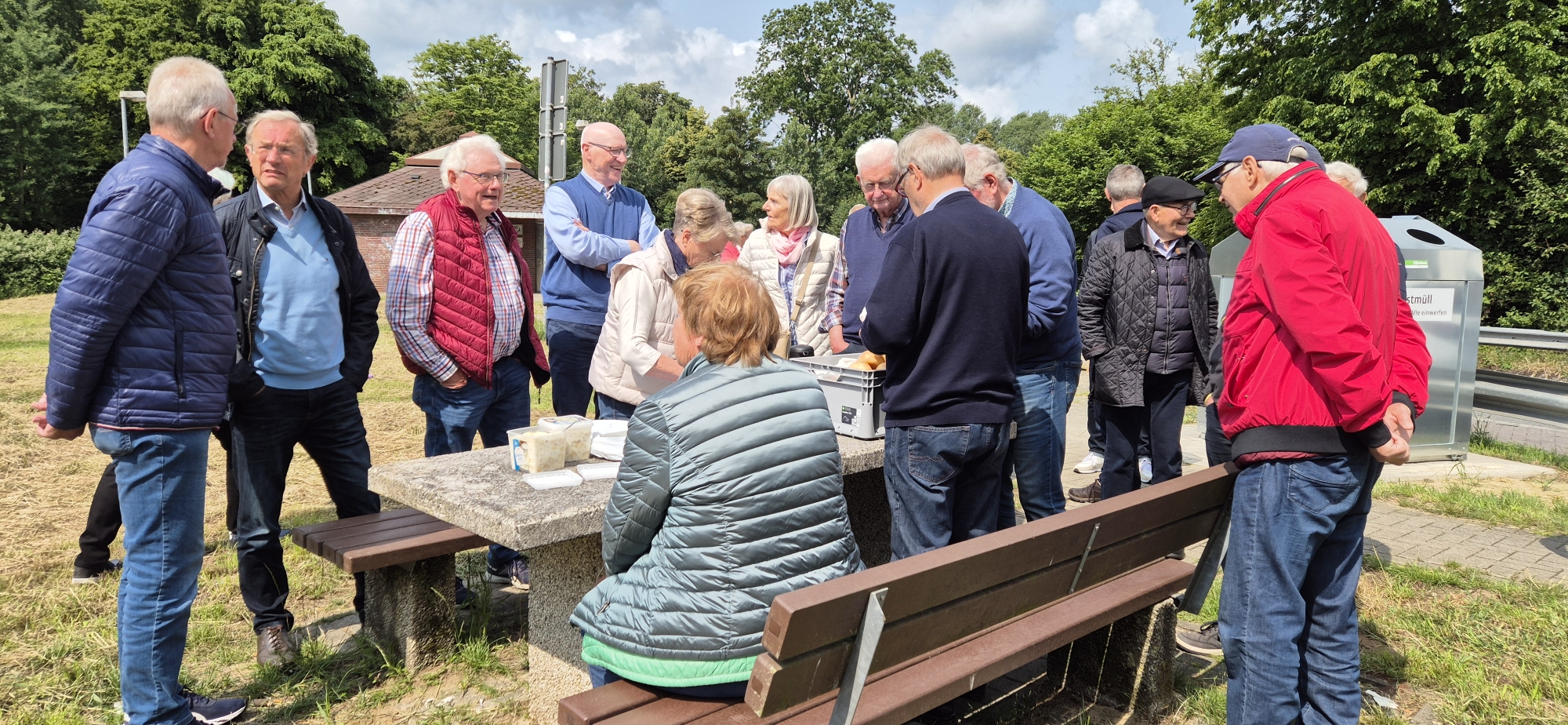 …war am Samstag, 09.08.2025, das traditionelle Biwak, diesmal organisiert vom 2. Bass unter ihrem Stimmensprecher Alfons Kemper – routiniert und in bester Manier. Bei strahlendem Sonnenschein, angenehmen Temperaturen und kühlendem Wind machte sich unsere Kolonne aus etwa 45 Personen (Sänger mit und ohne weibliche Begleitung) um 14:00 Uhr von unserem Vereinslokal Hotel Haus Fliederbusch auf ihren Zweirädern auf den Weg.