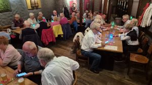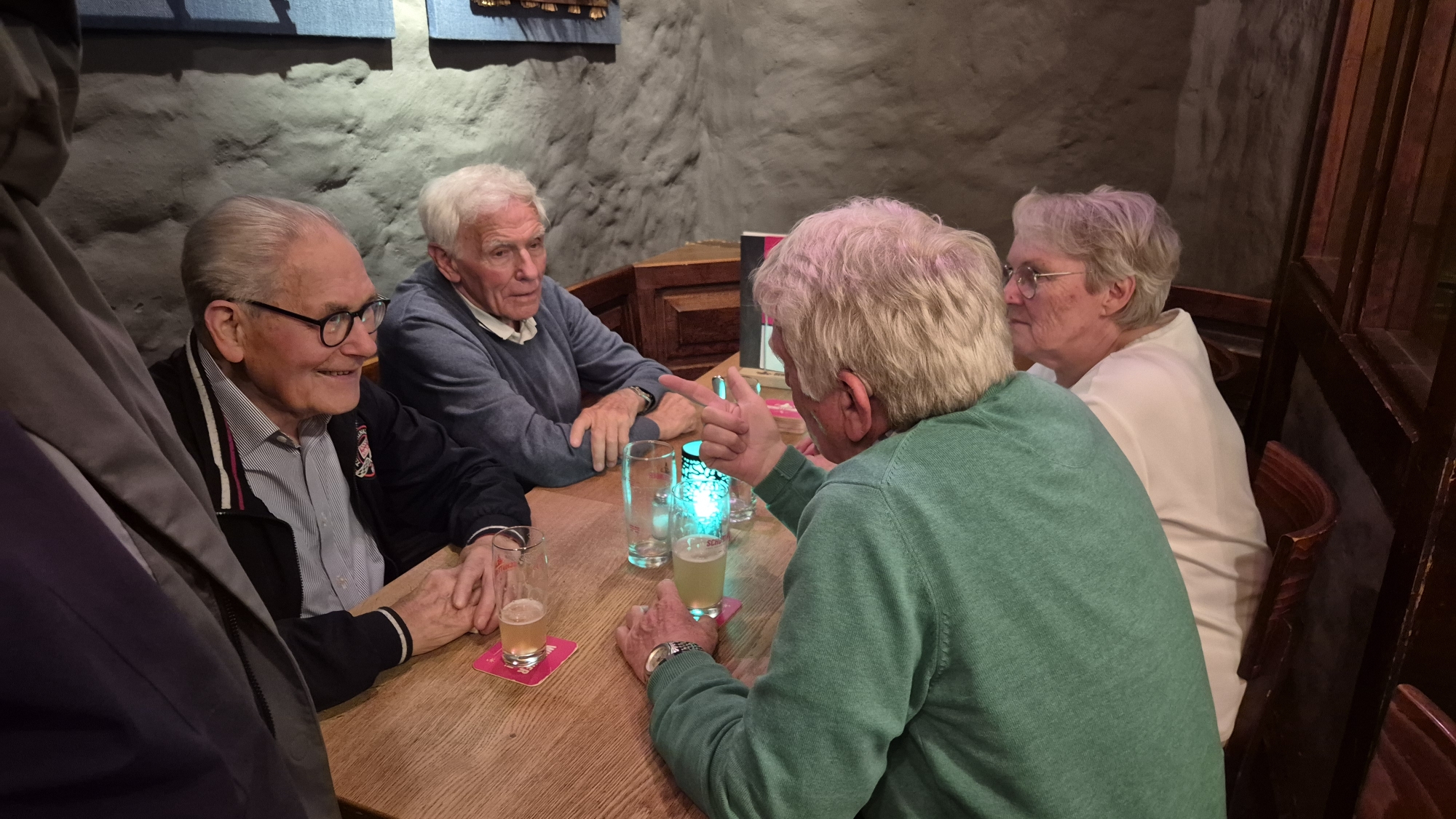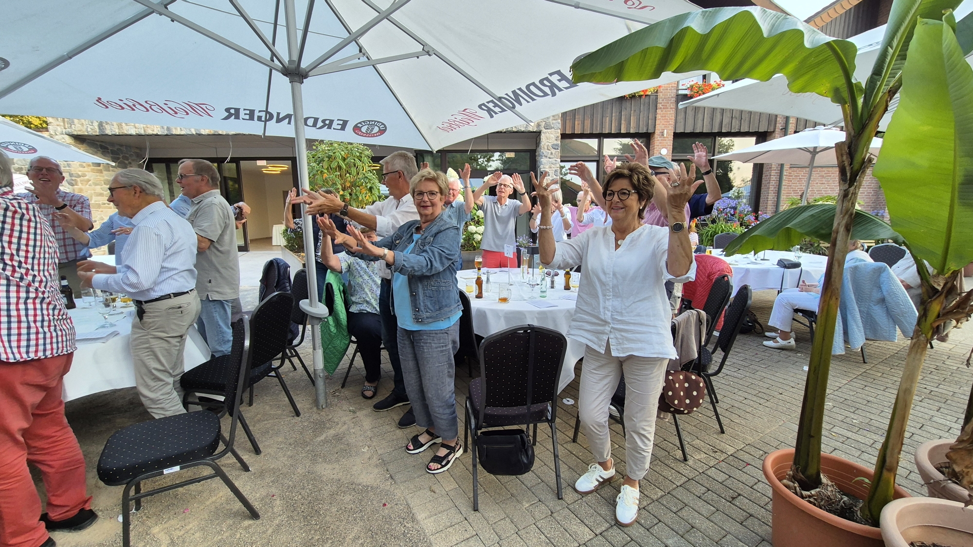 So waren wir gestärkt für das, was uns anschließend DJ Matthias Kropp aus Weseke musikalisch servierte. Über das Repertoire brauchte sich niemand zu beklagen; eine gute Auswahl aus Oldies, Swing, Rock-Pop etc. Erstaunlich, wie der eine oder die andere in der Lage war, das Tanzbein zu schwingen. Die Tanzfläche war zumeist gut besucht und man merkte, dass es allen Spaß machte. DJ Matthias verstand es, uns zu akrobatischen Verrenkungen mit anschließender Polonaise auf die Tanzfläche zu locken.