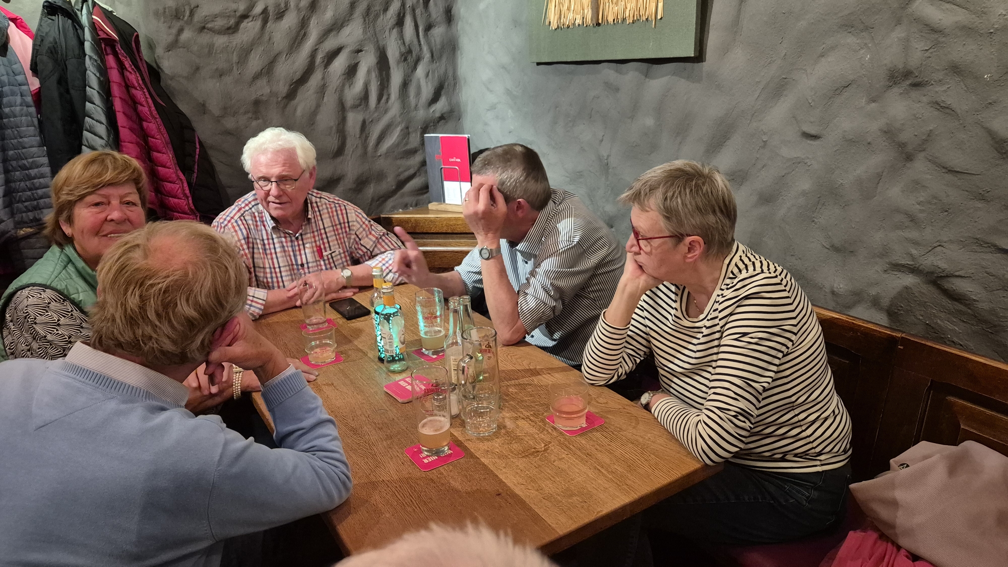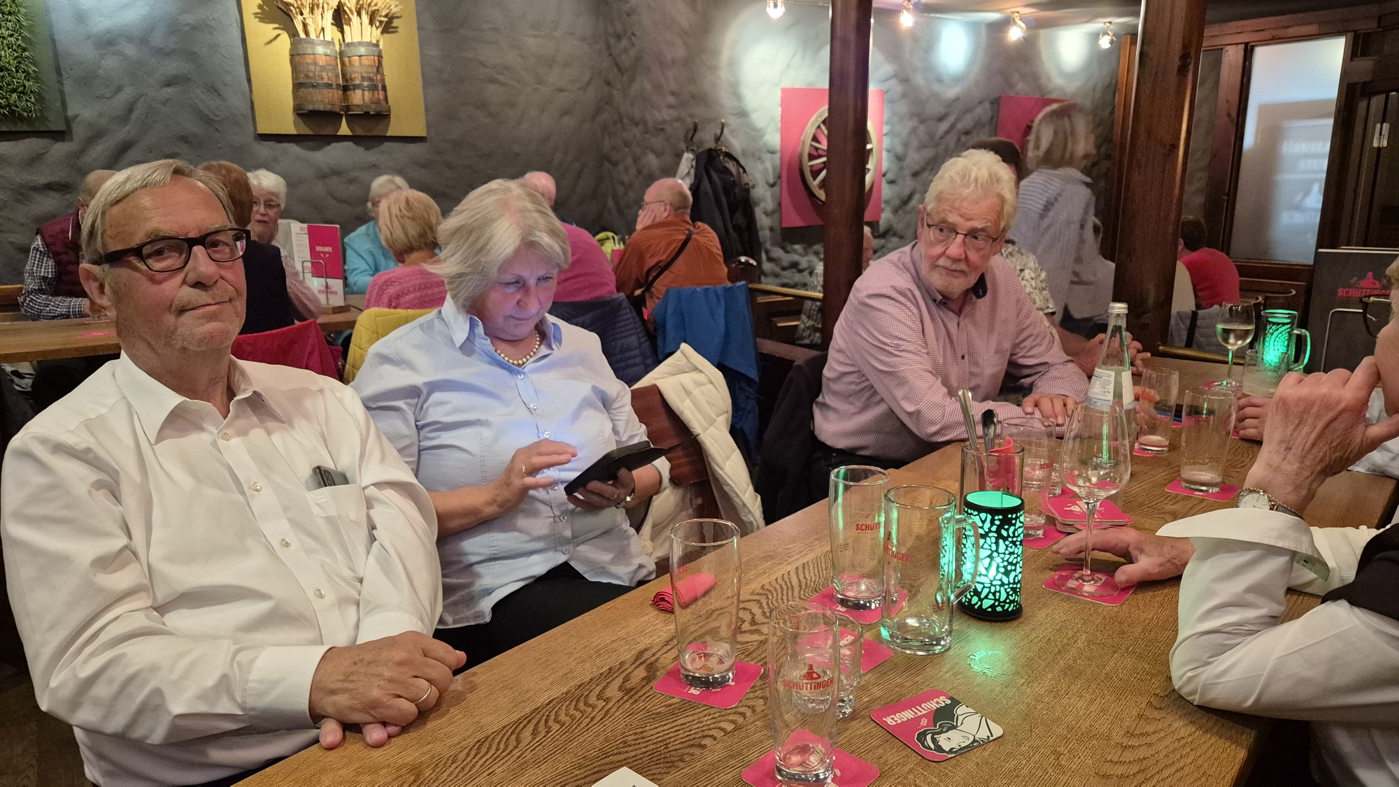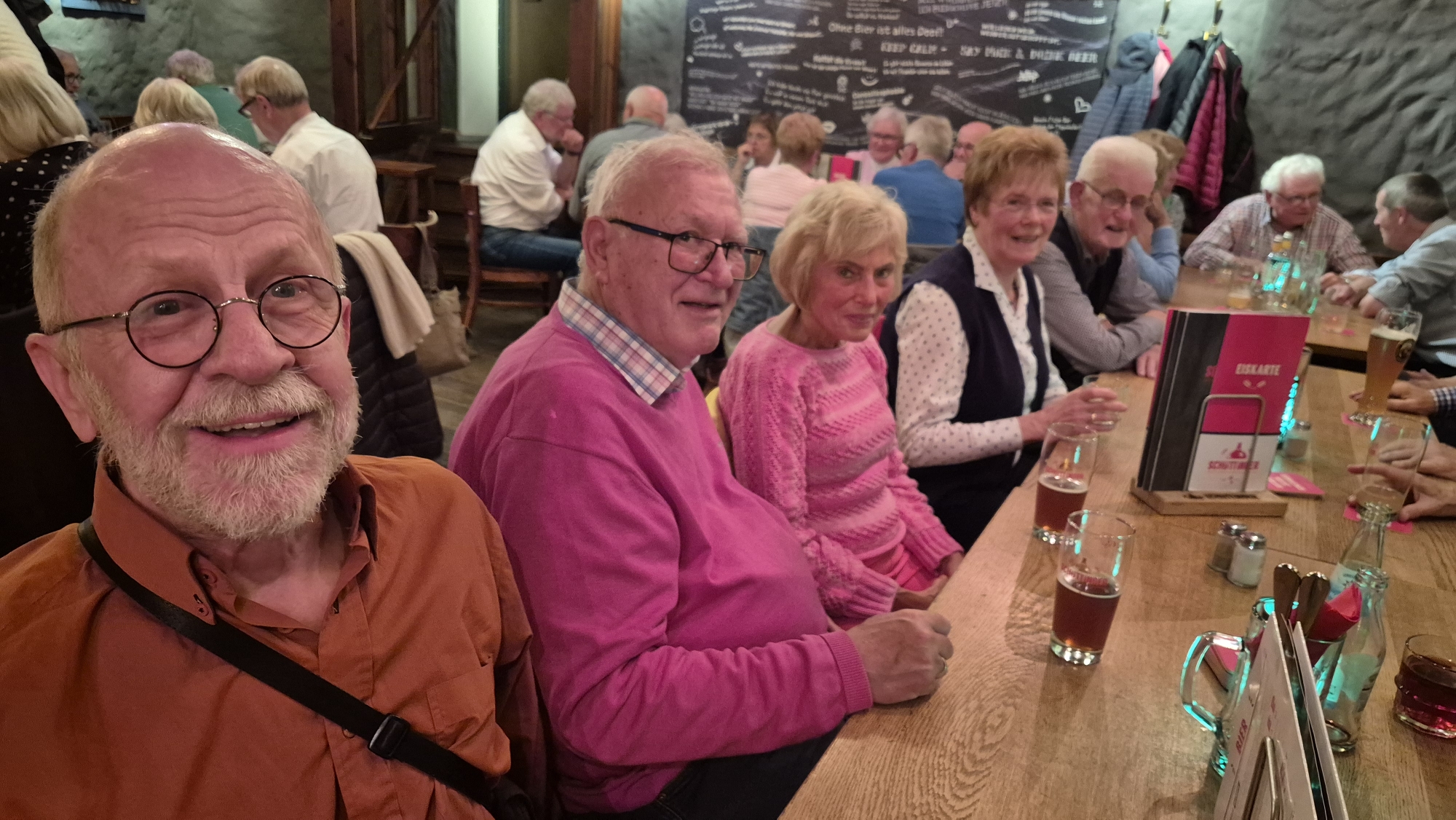 Gegen 18:00 Uhr setzte uns Busfahrer Bernd in der Altstadt ganz in der Nähe des Brauhauses und Gasthofes Schüttinger ab, wo wir in einem abgetrennten Bereich unter uns die gemütliche Atmosphäre und das vorbestellte Essen genossen. Gegen 20:00 Uhr brachte Busfahrer Bernd ein Teil von uns zurück zum Hotel, andere erkundeten die Altstadt und weitere Lokale.  Ein „harte Kern“ unserer Truppe hielt noch länger im Schüttinger aus.