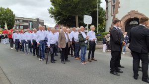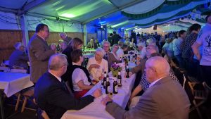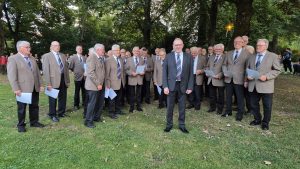 Am Krieger-Ehrenmal wurden wir schnell wieder auf den Boden der Tatsachen zurückgeholt. Angesagt waren Totengedenken und Kranzniederlegung. Unser Beitrag dort war der Vortrag zweier Lieder: „Allen Menschen Frieden“ und „Preiset den Herren der Welt“. Wetterbedingt nur jeweils eine Strophe. In einer Rede mit Gedenken nicht nur vergangener Kriege, besonders auch der Kriegswirren der Gegenwart, war von Feierlaune für den Augenblick nicht mehr zu denken. Sogar das Wetter schlug von sonnig und heiter um auf extrem windig, boeig (einem Feuerwehrmann wehte sogar die Fackel aus!) und ein paar Regentropfen waren auch dabei. Die vorsichtshalber einen Regenschirm dabei hatten, wähnten sich jedenfalls auf der sicheren Seite. Zum Einsatz brauchte er jedenfalls nicht mehr zu kommen. Wir waren ja auch nur einen Steinwurf vom Schützenzelt entfernt. In Paradeformation zogen wir mit ein ins Zelt. Wer Lust und Laune hatte, nahm das Angebot des Vorstandes des Schützenvereins an, und bei gespendetem Bier, bei Wein und Gesang klang der Abend für den einen früh, für den anderen zu vorgerückter Stunde, in jedem Fall aber fröhlich aus.