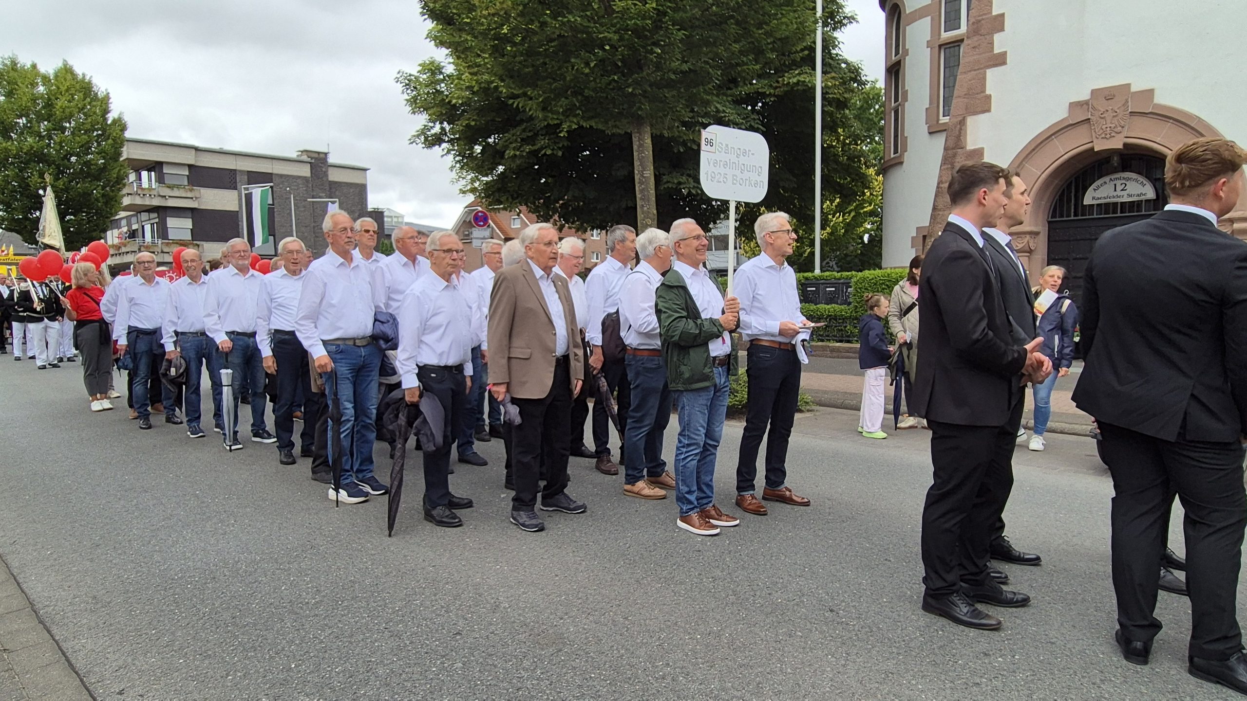 Am Sonntag, 06. Juli 2025, waren alle Borkener Vereine und bürgerliche Gruppierungen aufgerufen, am Festumzug zur Eröffnung der Jubiläums-Feierlichkeiten teilzunehmen. Da durften wir als inzwischen 100 Jahre existierende Sängervereinigung natürlich nicht fehlen. Lockere, wenn auch angemessene Kleidung (Sängerhemd und Jeans) war angesagt. Trotz unterschiedlicher Ansagen der Wetter Apps, die unangenehm frisches und nasses Wetter voraussagten, hielt sich das Wetter und auch die Temperaturen.