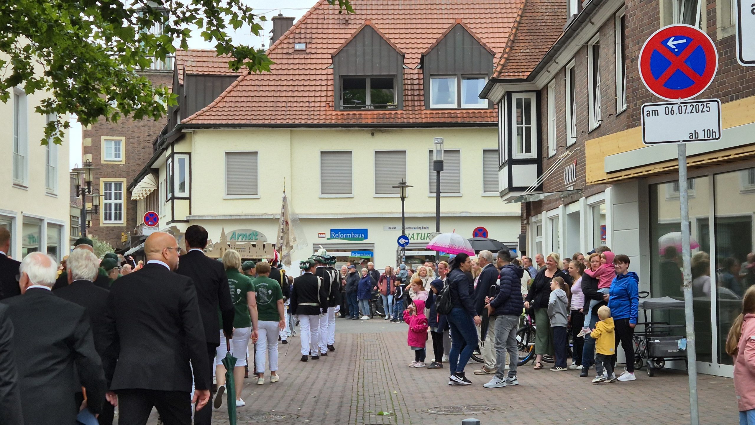 Zeit blieb dann noch genug zum fröhlichen Beisammensein, bevor die Musik, der Vorstand, die Vorgesetzten des Schützenvolkes und die große Zahl der St.-Johanni-Schützen nach Befehl angetreten waren. Nach den üblichen Regularien wie Parade auf dem Marktplatz, dem Großen Zapfenstreich und letztlich dem Singen der Nationalhymne bei dem wir stimmgewaltig mitsingen konnten, startete dann mit Musik und guter Laune die Große Parade durch die Innenstadt von Borken.