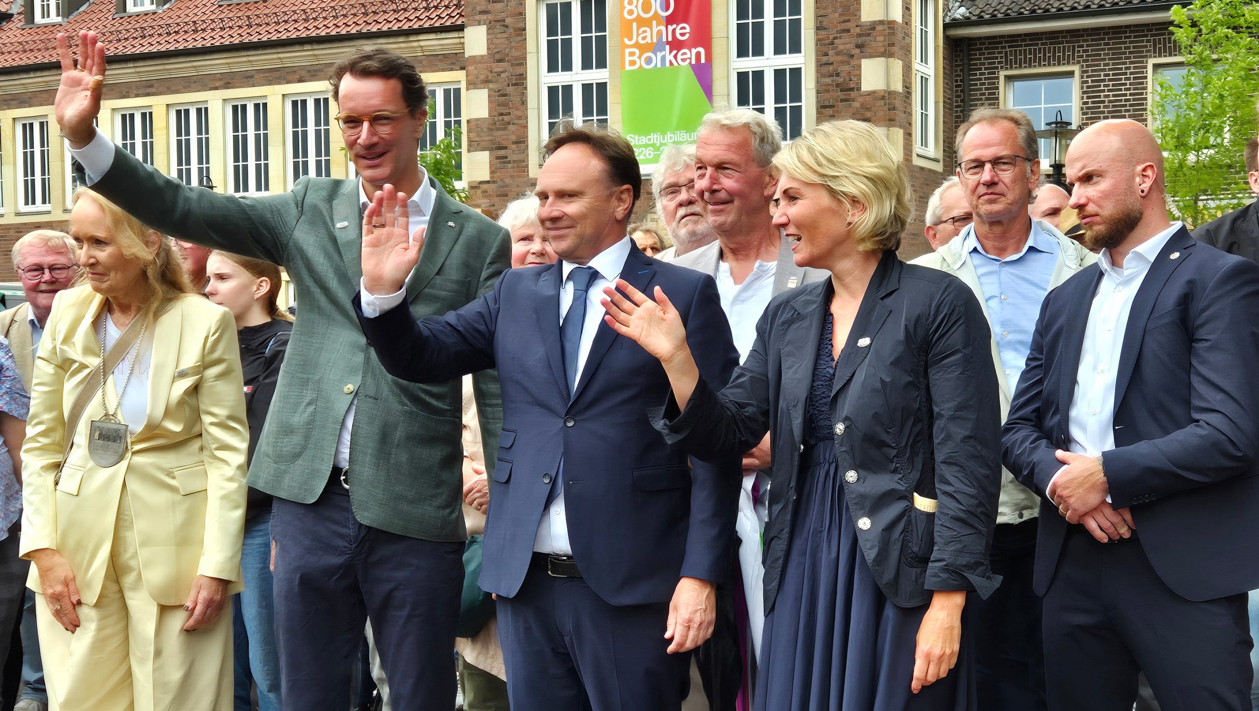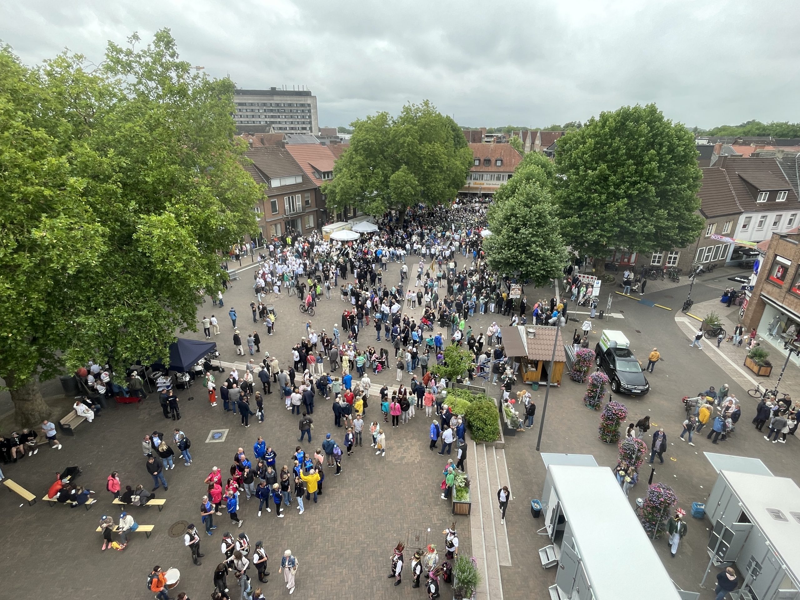Es ist erstaunlich, wie viel Interessierte jeden Alters auf den Beinen waren. Das Ziel, der Marktplatz, war proppenvoll. Die höchsten Vertreter von Stadt, Kreis und Land waren vertreten. Stolz standen unsere Bürgermeisterin Mechtild Schulze Hessing und der Ministerpräsident Hendrik Wüst nebeneinander und ließen es sich nicht nehmen, einige Worte ans Volk zu richten, das sich mit lebhaftem Applaus bedankte. Diese Auftaktveranstaltung lässt für den weiteren Verlauf der Jubiläumsfeier nur Gutes hoffen. HA