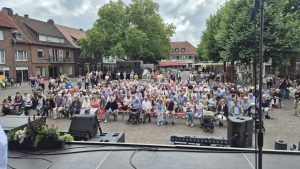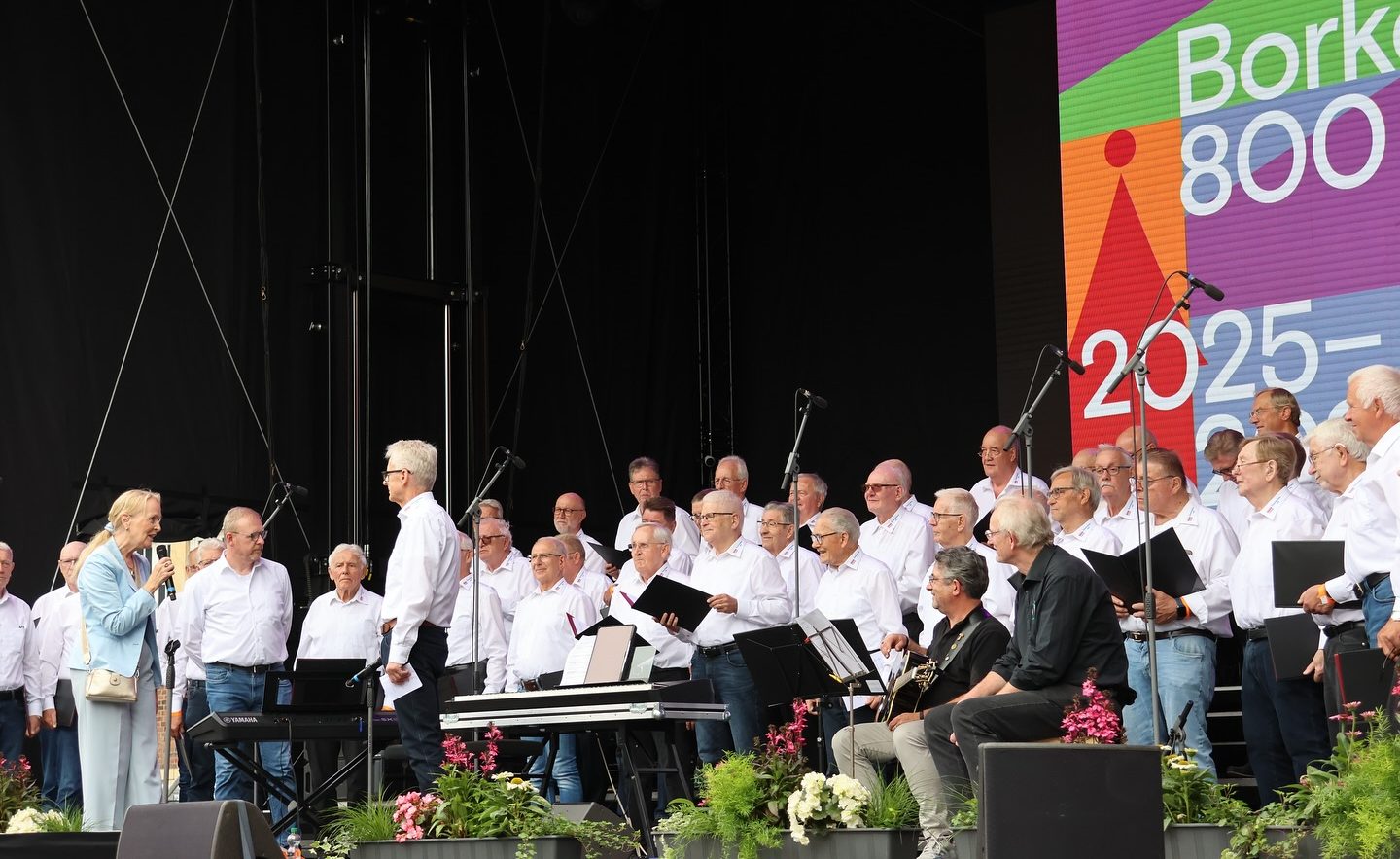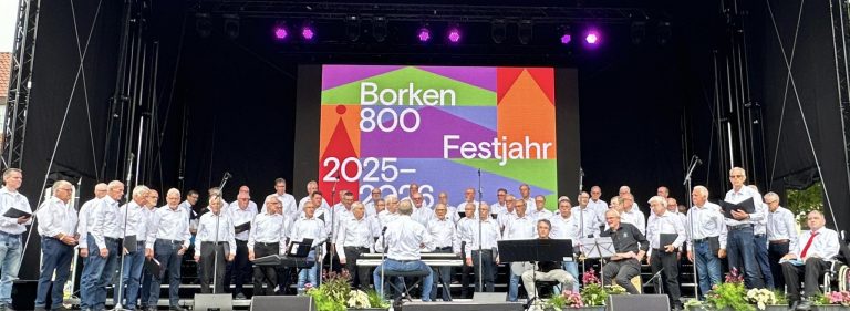 Anlässlich des Doppeljubiläums von Stadt und Chor hatte die Sängervereinigung 1925 Borken am Sonntag, 13. Juli 2025, mittags die Gelegenheit, die im Rahmen der Eröffnungswoche zur Feier des Stadtjubiläums aufgebaute große Bühne auf dem Borkener Marktplatz kostenlos zu nutzen. Mit dem Chorauftritt vor der wunderschönen Kulisse des FARB (Forum Altes Rathaus Borken) und mit Blick auf das bunt gemischte und gut gelaunte Publikum auf dem Marktplatz bekundeten wir unsere Verbundenheit mit der Heimatstadt unseres Männerchores und unsere Freude über das stolze Jubiläum der Stadt Borken (800 Jahre) und das einhundertjährige Bestehen unseres Chores.