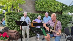 Nachdem alle das leckere Buffet des Fliederbusches ausgiebig genossen und den Neubautrakt des Hotels (Stuhl- und Notenlager, neue Toilettenanlage, Wintergarten) besichtigt und bewundert haten, unterhielten uns Hubert Mäsing, Georg und Magret Stegger sowie Manfred Bußmann unter Gitarrenbegleitung mit dem Singen alter „Plattföötlieder“ und sonstiger eigener Lieder aus ihrem Repertoire.