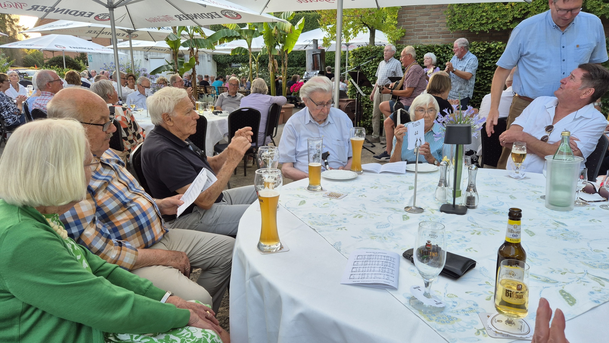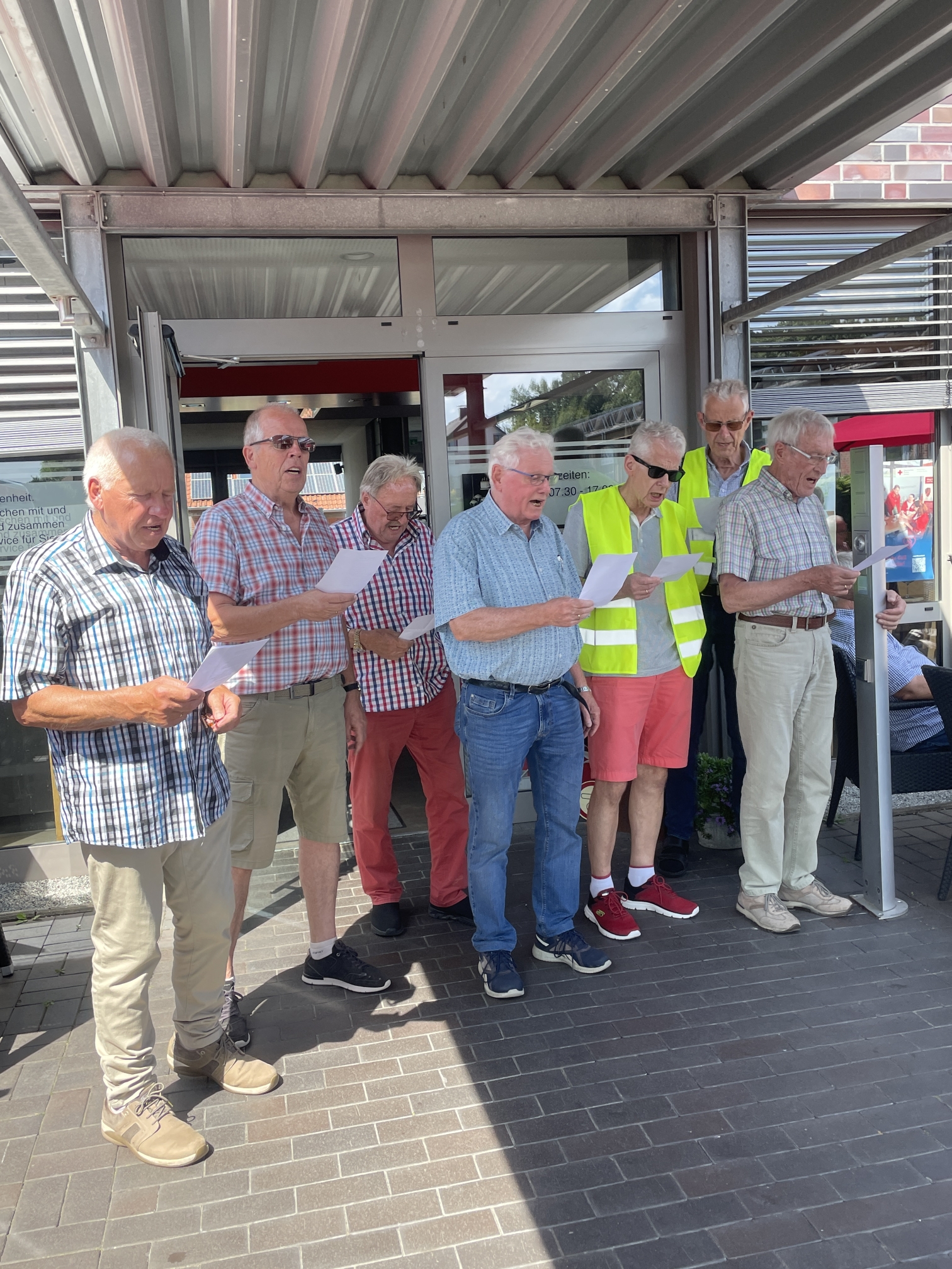 Alle waren geladen, nicht nur die Verwandtschaft, auch wir Sänger von Heiners Lieblingsverein, der Sängervereinigung Borken 1925. Das ließen wir uns nicht nehmen. 42 von uns waren der Einladung ins Vereinslokal Fliederbusch am Sonntagmorgen, 09. Juni 2024, gefolgt. Gut, dass wir fleißig vorgeübt hatten; Heiner hatte für sich und seine Zwillingsschwester Marlies Terhart schließlich Lieder gewünscht, die wir immer mal singen, aber – wie sich herausstellte – vom Text und von den Noten her verbesserungswürdig waren. Einige von uns, auch „alte Hasen“, sahen manche Notenblätter zum ersten Mal! Bei der Probe waren auch Stimmen zuhören, die sagten, dass wir viel zu selten die schönen alten Lieder singen. Einer meinte gar, es sei doch schade, dass er beim Gesangsvortrag zu Heiners Jubelfeier nicht dabei sein kann.Heiner hatte bestes Wetter bestellt. So waren nicht nur wir, sondern auch die Geburtstagsgäste in bester Laune. Daran beteiligt auch erneut die tolle Liedauswahl! In dieser Reihenfolge klang es aus voller Brust (oder auch ganz leise, so wie es