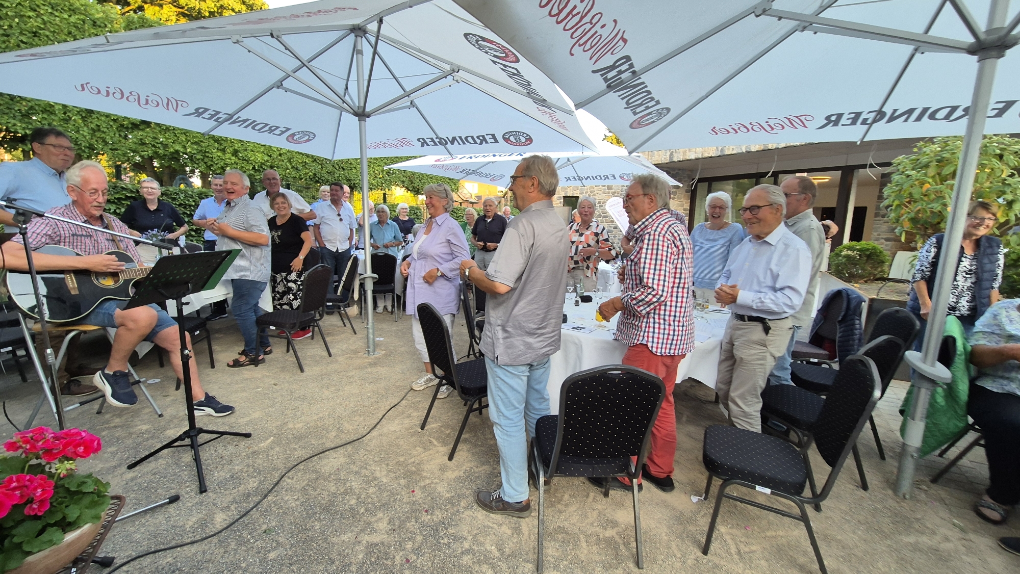 anlässlich der Feier des 80. Geburtstages von Friedhelm Eberz für ihn, seine Frau Ulla und seine zahlreichen Gäste am Samstag, 14.07.2023 im Haus Waldesruh. Die „einfachen“ Sangesbrüder genossen einige Gläser kostenloser Kaltgetränke und waren sehr zufrieden damit.